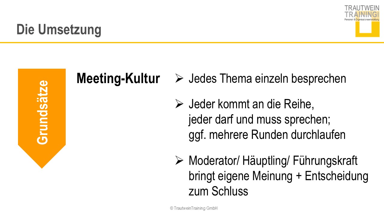 Dabei sind Meetings die Basis jeder Teamkultur. Sie sind die Chance für jedes Team die unterschiedlichen Perspektiven zusammenzubringen, um daraus passende Lösungen oder etwas völlig Neues erschaffen zu können. Ein Team definiert sich nicht dadurch, dass verschiedene Leute an einer Sache herumwursteln. Ein Team macht dann Sinn, wenn man gemeinsam mehr und besseres erreichen kann, als wenn jede und jeder allein für sich arbeitet.