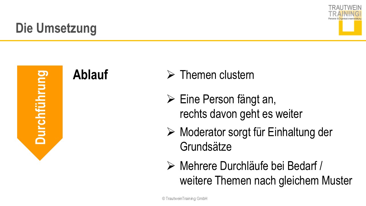 - Ggf. bei völlig neuen Aspekten noch eine Runde machen, zum Thema, unter dem Blickwinkel des neuen Aspektes.