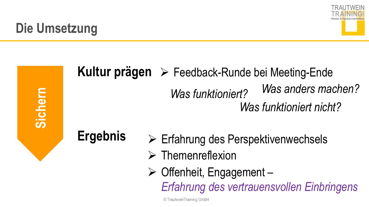 Die Technik an sich ist bereits sehr wirkungsvoll. Für das Win-Win-Mindset und die notwendige Energie, um eine Kultur „mit liebevoller Penetranz“ langfristig zu kultivieren braucht es ein besonderes Standing.