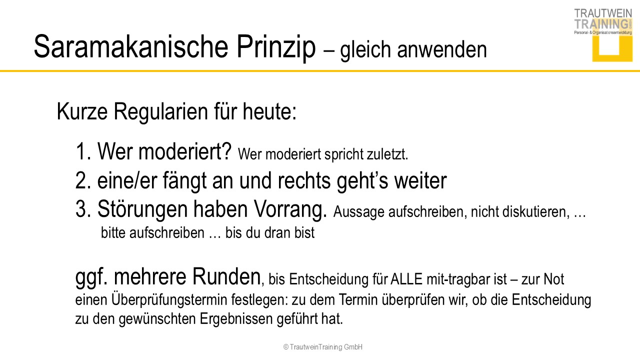 Hieraus formulierte sich „das Saramakanische Prinzip“ – für die Teammeetings unserer Welt. Es ist für uns zu einem wertvollen Instrument für das Nutzen von Teampotenzialen geworden, das wir und viele unserer Kundinnen und Kunden nie mehr missen möchten.